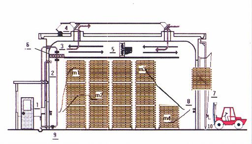 頂風機型干燥窯屬周期式強制循環(huán)干燥窯,風機置于干燥窯頂部,采用耐高溫、高濕電機和防腐鋁壓鑄葉輪組裝在風機架上,并按氣流方向分為正壓區(qū)和負壓區(qū)。風機可正逆定時換向旋轉,氣流隨之改變循環(huán)方向,以此實現了通過材堆的氣流分布均勻而獲得很好的干燥質量。